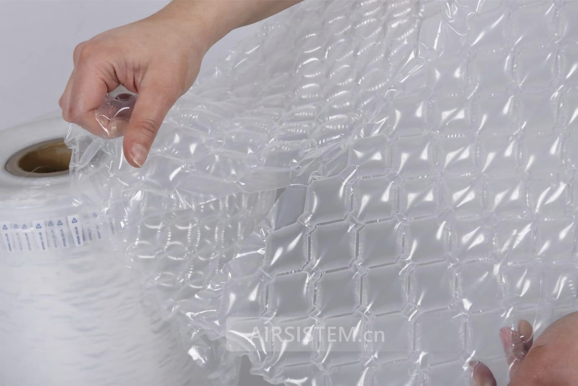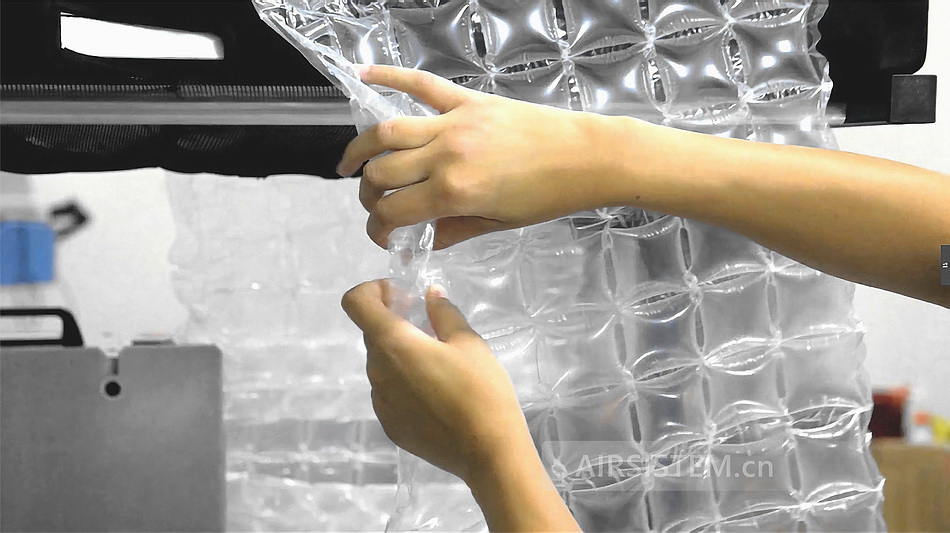 AIRSISTEM方形气泡膜实时在线充气,边充边用,不占空间,可节省大量的仓储和运费费用。充气后的气泡膜制成品叫气泡袋,主要用于产品包裹,保护包装,吸收各个方向的冲击,为产品提供出色的缓冲保护。一卷AIRSISTEM气泡膜相当于90倍的泡沫包装所需要的空间。