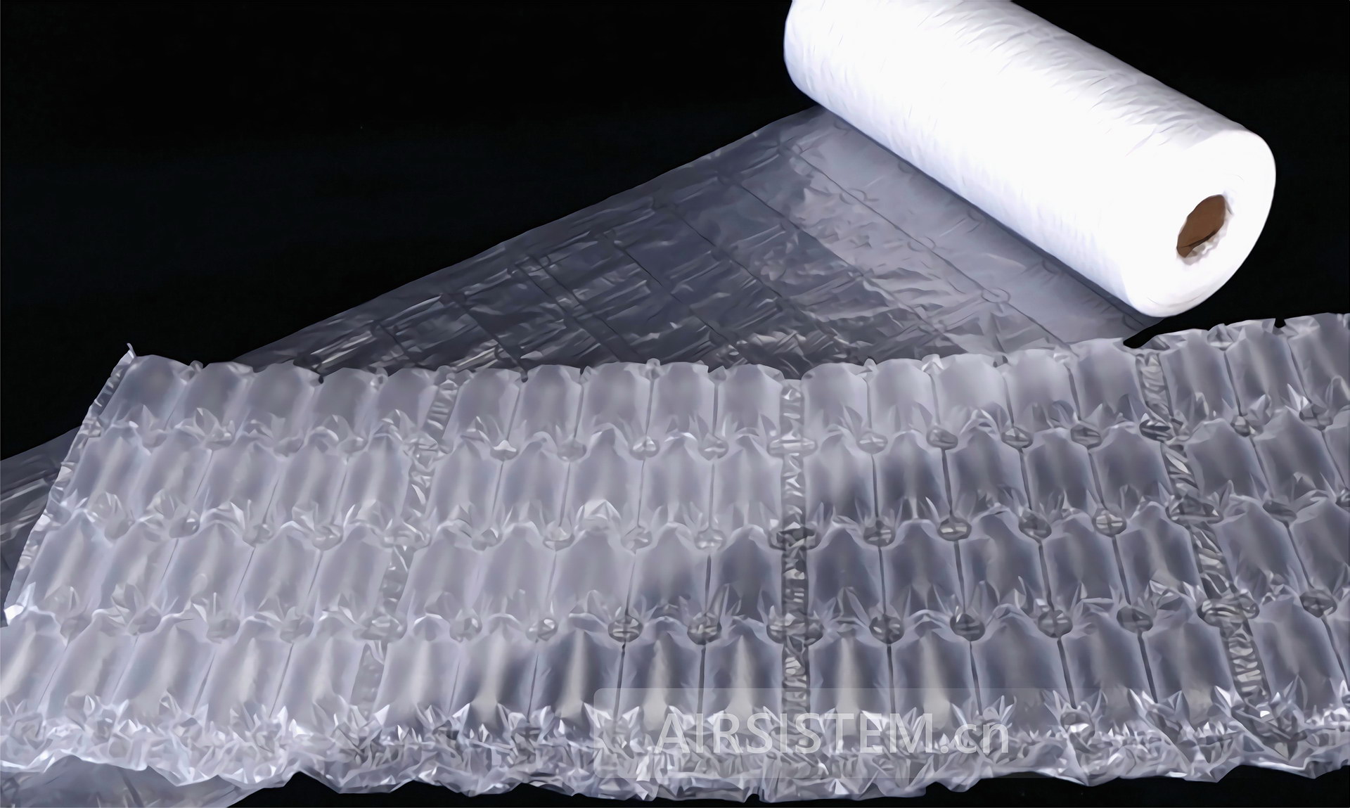AIRSISTEM四联排气泡膜实时在线充气,边充边用,不占空间,可节省大量的仓储和运费费用。充气后的四联排气泡膜制成品就叫四联排气泡袋,主要用于产品包裹,保护包装,吸收各个方向的冲击,为产品提供出色的缓冲保护。一卷AIRSISTEM气泡膜相当于90倍的泡沫包装所需要的空间。